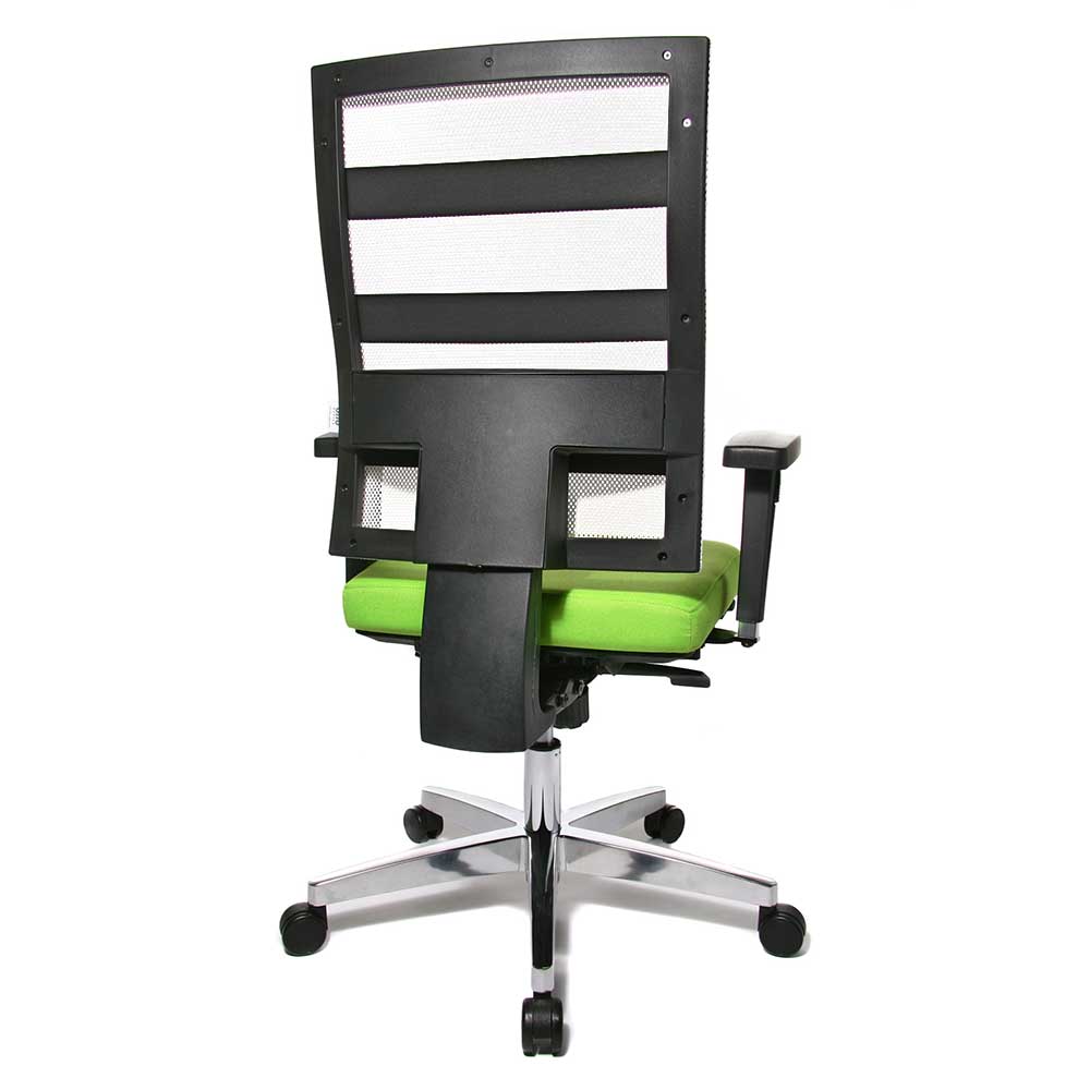 Design-Drehstuhl in Netzoptik. Punktsynchron-Mechanik, zur synchronen Verstellung der Sitz- und Rückenlehnenneigung, Federkraft individuell auf das Körpergewicht einstellbar, mehrfach arretierbar. Stufenlose Sitzhöhenverstellung mit Toplift. Rückenlehne mit atmungsaktiver Netzbespannung, höhenverstellbar über "up-and-down"-System, Lehnenrückseite mit elastischen Gummibändern. Bequemer Flachsitz mit komfortabler Knierolle. Aluminium-Fußkreuz poliert, ausgerüstet mit lastabhängig gebremsten Sicherheitsdoppelrollen für Teppichböden
